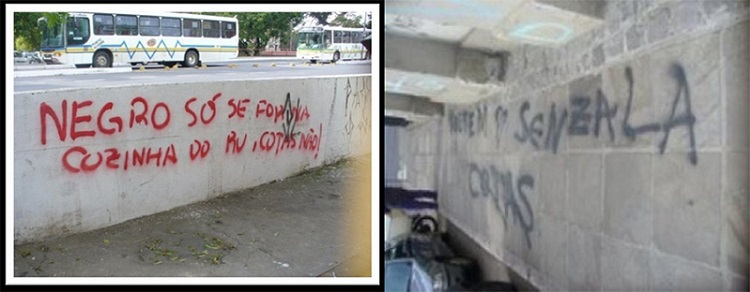 O debate para implementação de ações afirmativas no ensino de graduação da UFRGS iniciou-se em 2005, influenciado pelas experiências na UnB, na Uerj, entre outras IES pioneiras, aqui já mencionadas, que adotaram a reserva de vagas no início dos anos 2000. O engajamento e a mobilização acadêmica (professores, alunos, funcionários) e dos movimentos negros e indígenas pressionou o Conselho Universitário (Consun) a aprovar, em junho de 2007, o sistema de cotas para estudantes oriundos de escola pública e para autodeclarados negros e indígenas, o qual entraria em vigor no vestibular do ano seguinte. A votação no Consun terminou com 43 votos a favor e 27 contrários, após mais de seis horas de intensos debates. A véspera da decisão foi marcada por um clima de tensão. De um lado, manifestantes a favor do programa de ação afirmativa acamparam em frente ao prédio da reitoria. Do outro, durante a madrugada, grupos racistas picharam em alguns prédios da UFRGS frases como “Voltem para a senzala, cotas não” e “Negro só se for na cozinha do RU [restaurante universitário], cotas não!” (Figura 1). Além disso, tais grupos também passaram a semana proferindo insultos e ameaças racistas em redes sociais na internet.
