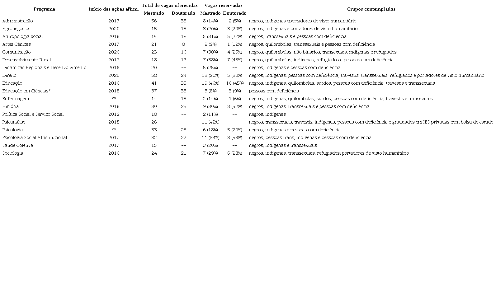 ABSTRACT: The debate around affirmative action in Brazilian graduate education is relatively recent. The literature on the subject indicates that the adoption of affirmative actions by the graduate programs of Brazilian public HEIs dates from the early 2000s. The discussion was intensified in the second decade of the 21st century, in the context of the enactment of the 12.711/2012 Federal Law, which instituted the reservation of undergraduate vacancies for black and public school students in the federal higher education network, and of the 12.990/2014 Federal Law, which established the reservation of 20% of vacancies in public official selections for black candidates. More recently, the Ministry of Education published Ordinance No. 13/2016, which determined that federal higher education institutions should submit proposals for the inclusion of blacks, indigenous people, and people with disabilities in their graduate programs, also creating specific commissions for affirmative action. Within this broader context, we have sought to provide in this article an overview of the current scenario of affirmative action policies in graduate courses at the Federal University of Rio Grande do Sul (UFRGS). The results mainly show that the implementation of the reservation of vacancies in UFRGS programs started in 2016, which may be a reflection of Ordinance No. 13/2016. Following a national trend, other social markers of difference in addition to ethnic-racial ones have been considered as criteria for reservation of vacancies; there are significant differences between the rules of the notices, given the lack of a general rule within the university for all programs.