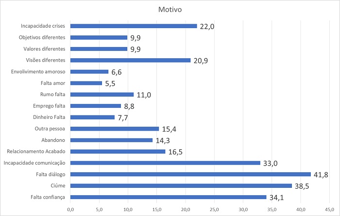 Entre os motivos elencados para explicar os conflitos vividos, falta de diálogo (41,8%), ciúmes (38,5%), falta de confiança e incapacidade de comunicação (33%) foram os que mais registros obtiveram dos respondentes desta amostra de pesquisa.13 Também tiveram índices expressivos os itens incapacidade para enfrentar crises (22%) e visões diferentes de mundo (20%). Entre outros registros dignos de nota estavam explicações de que o relacionamento tinha acabado (16,5%); havia outra pessoa (15,4%); e houve abandono (14,3%).