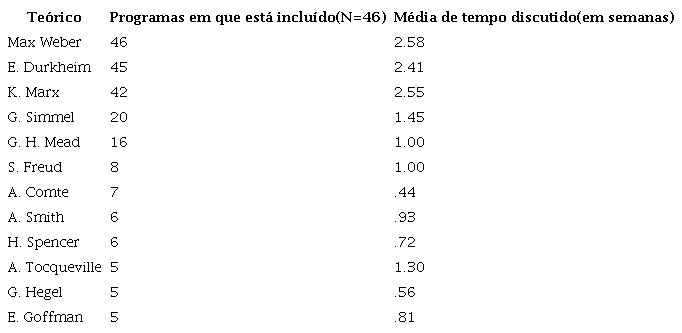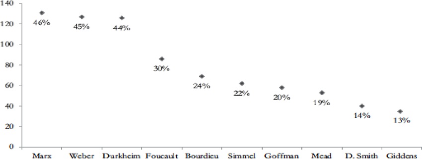 No que diz respeito ao ensino, nem sempre é fácil saber exatamente qual é o conteúdo dos cursos, principalmente quando não existe o hábito de elaborar currículos, como é o caso da França, por exemplo. A prática curricular anglo-saxônica torna mais fácil listar quais autores são de fato citados e ensinados. Seja nos Estados Unidos ou no Canadá, os autores citados com mais frequência são praticamente os mesmos (ver Figuras 1 e 2), a trindade Marx, Weber e Durkheim encabeçando a lista, seguidos apenas de estudiosos das ciências sociais ocidentais. É impressionante notar essa continuidade enquanto, ao mesmo tempo, ocorria a discussão sobre a necessidade e a própria existência de um “núcleo sociológico” (entre outros, ver Abbott, 2000; Keith & Ender, 2004; Ballantine et al., 2016; Oromaner, 1968).