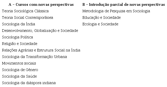 Ao decidir quais cursos e como eles deveriam ser concebidos, os coordenadores de áreas, em seu primeiro encontro, insistiram em que cada curso deveria incluir uma perspectiva histórica crítica, o que ajudaria a reformular os cursos em termos contemporâneos. Isso levou a discussões para repensar os temas do curso. Por exemplo, sobre o tópico “sociologia rural”, disciplina ainda hoje oferecida em muitas universidades da Índia, que precisava mudar (foi alterado para Relações agrárias e Estrutura Social na Índia) ou sobre o tópico “Sociologia da Religião”, imerso na linguagem ocidental, que deveria ser reformulado para Religião e Sociedade. Outras questões também foram postas em pauta, tais como: se deveríamos introduzir conteúdos como Família e Parentesco, Sociologia Industrial ou Sociologia de Casta e Tribo? Se sim, qual seria sua perspectiva crítica? Chegou-se a um consenso de que os cursos deveriam questionar os pressupostos dominantes/hegemônicos na pesquisa e no ensino contemporâneos e substituí-los por perspectivas subalternas. A sociologia deve incluir vozes de várias posições sociais. Dada a forma como a sociologia é recebida e disseminada na esfera pública indiana, era imperativo projetar um currículo crítico e reflexivo que, por sua vez, eludiria as narrativas nacionalistas paroquiais e as visões coloniais entranhadas na disciplina. Simultaneamente, afirmou-se haver um esforço para apresentar uma apreciação global de questões e temas, que incluísse perspectivas diversas de diferentes regiões do mundo.