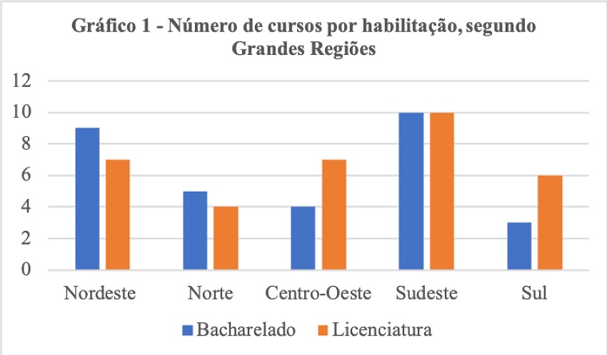 Somando-nos ao esforço de contribuir no entendimento crítico da atual organização do ensino da sociologia e da teoria sociológica nas instituições de ensino superior e buscando explorar o desenho dos cursos de graduação atualmente oferecidos, apresentaremos uma análise da estrutura das disciplinas de teoria em alguns cursos em funcionamento. A busca inicial dos cursos foi feita por meio de consulta ao Cadastro Nacional de Cursos e Instituições de Educação Superior, Cadastro e-MEC.6 No site, buscamos por cursos de graduação em Ciências Sociais; ativos; gratuitos, de forma a encontrar instituições públicas federais; presenciais; tanto bacharelados quanto licenciaturas; e que tenham sido avaliados com conceito de curso de 3 a 5, o que indica a aprovação do curso pelo MEC.7 A pesquisa retornou 67 cursos disponíveis no país. Desses, foram retirados os cursos de Antropologia e do bacharelado em Ciências Sociais da Universidade de Brasília, na medida em que o percurso formativo é comum entre estudantes dos cursos de bacharelado e licenciatura em Sociologia, já presentes no corpus. Iniciamos a pesquisa com 65 cursos, distribuídos em todo o território nacional (há instituições em 22 estados e no Distrito Federal), com predominância da região Sudeste, como aponta o Gráfico 1: