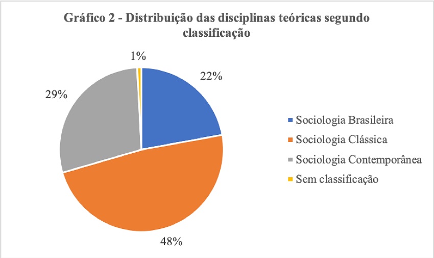 No que tange às disciplinas, tal como aponta Oliveira (2015), há uma concentração das disciplinas teóricas nos primeiros quatro semestres de formação dos estudantes, em que os cursos mais comumente ministrados são Sociologia I, II e III, com variações, em geral pequenas, na nomenclatura e conteúdo das ementas (Tabela 4). A nomenclatura usada atesta que a referência à ideia da história da sociologia é ausente nas disciplinas oferecidas. Quando analisadas em grandes categorias, as disciplinas de teoria dividem-se entre aquilo que se convencionou chamar de Sociologia Clássica e Contemporânea, sendo o critério temporal o recorte para a separação das disciplinas e de suas ementas. Usando essas classificações amplas, 48% das disciplinas analisadas poderiam ser enquadradas (com base na autoria indicada para o curso) como disciplinas de Sociologia Clássica; 29% como Sociologia Contemporânea e 21% como Sociologia Brasileira (Gráfico 2). Apenas a disciplina Tradição e contemporaneidade do pensamento sociológico, do bacharelado da UFJF, tem uma estrutura que foge a essa classificação ao misturar autores tidos como clássicos e contemporâneos. O curso que mais oferece disciplinas teóricas obrigatórias é o bacharelado da UFMA, que conta com seis disciplinas teóricas (Sociologia I a VI). As quatro primeiras são voltadas ao estudo de Comte, Marx, Durkheim e Weber. As duas últimas a autores da contemporaneidade, como Wright Mills, Benjamin, Bourdieu e Elias. Em nenhuma dessas seis disciplinas são abordados autores ou debates da sociologia brasileira e não há disciplinas obrigatórias voltadas para a reflexão sobre o Brasil.