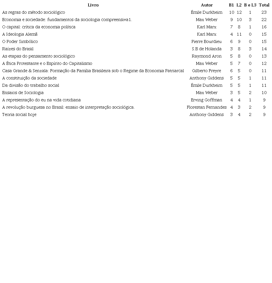 A análise dos autores mais indicados ressalta a centralidade da tríade de clássicos apontada fartamente pela literatura e da qual falamos anteriormente. Em ordem do número de citações, Marx, Weber e Durkheim constituem os três principais nomes (Tabela 5) e As regras do método sociológico, Economia e sociedade e O capital (Tabela 6) os textos mais indicados desses autores quando se reflete sobre os anos iniciais de formação da Sociologia. Digna de nota também é a presença de As etapas do método sociológico, de Raymond Aron, como a sétima obra mais indicada. Nessa obra, publicada pela primeira vez em 1967 na França (e traduzida em 1982 para o português), Aron revisita autores europeus do cânone e reconstrói os eventos históricos que permearam a produção social no estabelecimento da sociologia, reafirmando a importância da modernidade no estabelecimento da ciência social ao final do século XIX. A presença deste livro como referência reforça o lugar de uma narrativa em torno do cânone e a pouca abertura para outras perspectivas da história da sociologia.