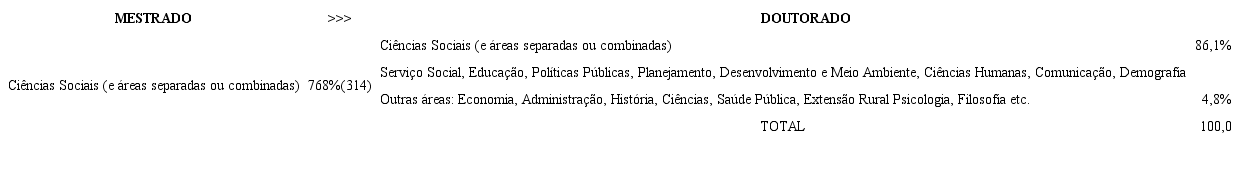 Mas esse quadro – uma tentativa de reconstruir caminhos alternativos de profissionalização merece mais atenção, pois mostra que, na verdade, considerando-se as Ciências Sociais de forma geral e não apenas a sociologia, o percurso típico do cientista social pode ser desenhado a partir daqui. Seria um profissional graduado em Ciências Sociais (três quartos deles), seguindo o mestrado (76,8%) e o doutorado (81,5%) na mesma área. Além dessa trajetória típica de formação, o mestrado parece funcionar como um catalisador de vocações para a área, fortalecendo mais ainda a proporção dos que completam o doutorado nas Ciências Sociais.