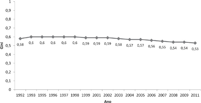 Nos últimos 19 anos, que correspondem ao período de 1992 a 2011, a desigualdade de renda, medida pelo índice de Gini, exposto no gráfico abaixo (gráfico 1), mostra decréscimo constante.5 Ainda que isso possa representar um avanço, é importante salientar que o decréscimo foi de modestos 0,07 pontos, e ainda continuamos figurando entre os países mais desiguais do planeta. Considerando apenas a chamada “década inclusiva” (Neri, 2012), a diferença permanece em 0,06 pontos, longe de ser, portanto, um indicador de que a igualdade brasileira tenha levado à consolidação de uma sociedade de “classe média”.