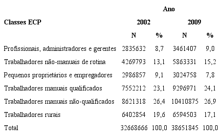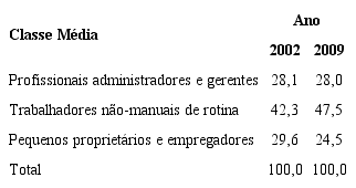 Importante enfatizar que as categorias não-manuais, que se aproximam mais da concepção de classe média, se mantiveram na ordem de 32% da população masculina com idade entre 24 e 60 anos, considerando os anos de 2002 e 2009. E considerando apenas este segmento não-manual, chegamos à seguinte tabela (tabela 2):