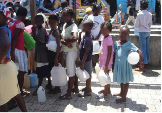 A violência estrutural da urbanização haitiana já fora profundamente configurada pela ocupação americana de 1915-34, pela posterior ditadura de Duvalier, pela supressão dos movimentos democráticos e pela imposição de políticas neoliberais de ajuste estrutural que deslocaram as comunidades rurais e impulsionaram a rápida urbanização e o crescimento descontrolado de Porto Príncipe desde a década de 1980 (Arthur & Dash, 1999). Isso fez com que a população que habitava barracos improvisados, sem acesso a serviços públicos, ficasse especialmente vulnerável ao terremoto, bem como às frequentes inundações, furacões e secas. Quando o terremoto de 2010 destruiu inúmeros reservatórios comunitários de água, única fonte hídrica dessas comunidades, e as pessoas foram deslocadas para acampamentos temporários, a água teve de ser transportada por caminhão e distribuída por organizações humanitárias. Essas, muitas vezes, dependiam de mulheres e crianças para fazer o trabalho de distribuí-la (ver Figura 1).