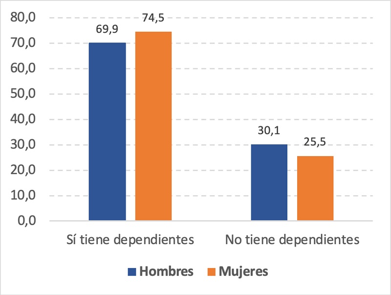 En la encuesta que aplicamos a personas repartidoras no preguntamos su estado civil; sin embargo, suponemos que entre las mujeres que trabajan en plataformas hay un grupo constituido por madres solas en hogares monoparentales que declararon que tienen a su cargo hijas e hijos, personas adultas mayores y personas con alguna discapacidad. Nos interesa en este trabajo examinar los elementos que tienen en común y las diferencias entre las mujeres con y sin dependientes a su cargo.