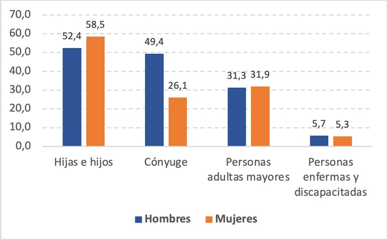 La gráfica 2 nos muestra que estas personas dependientes, en el caso de las mujeres, son principalmente las hijas y los hijos y, en segundo lugar, las personas adultas mayores, mientras que en el caso de los hombres son las hijas y los hijos y después la cónyuge. Es decir, sobre las mujeres, hay una fuerte presión de llevar un sustento económico a sus hogares para alimentar y proveer de todo lo necesario a sus hijas e hijos menores.