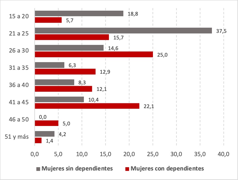 Esto puede significar que estamos ante dos grupos de mujeres con niveles socioeconómicos distintos: las mujeres sin dependientes, más jóvenes y con mejor posición socioeconómica, y las mujeres con dependientes, mayores, con menores niveles de escolaridad y con más urgencia de este tipo de empleos para poder sustentar a sus dependientes.