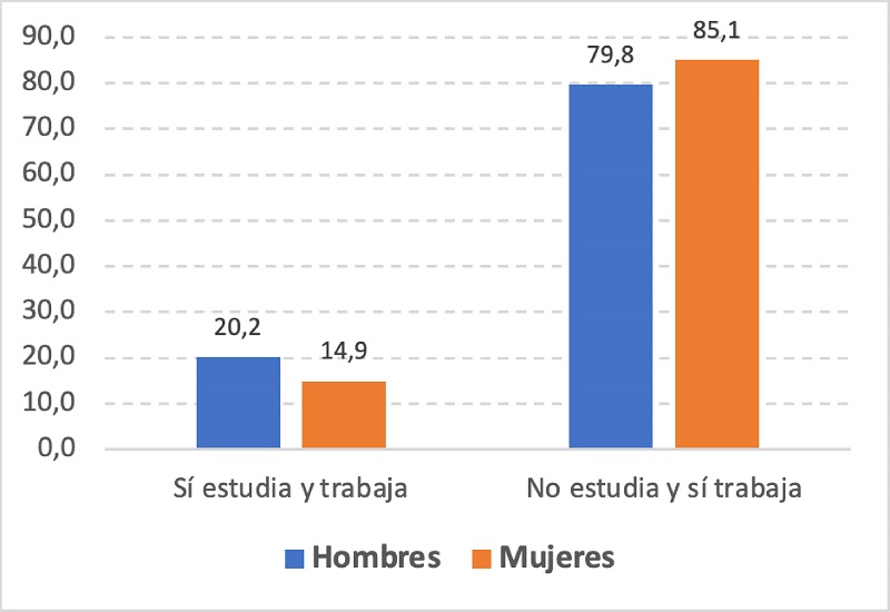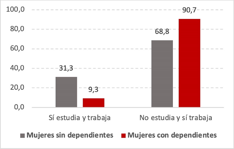 Cuando se compara a las mujeres con y sin dependientes en relación con los estudios (Gráfica 6) se pueden observar claras las diferencias: hay el triple de mujeres sin dependientes que estudian (31%) respecto de las que tienen dependientes a su cargo que también lo hacen (9%), es decir, el tiempo que pudieran dedicar a continuar con su formación lo dedican al trabajo de cuidados no remunerado de las personas que aún dependen económicamente de ellas. Este hecho denota una gran desigualdad presente para el futuro entre los dos grupos de mujeres, porque las aspiraciones y las oportunidades laborales que se presentarán a ambas podrá ensanchar sus desigualdades.