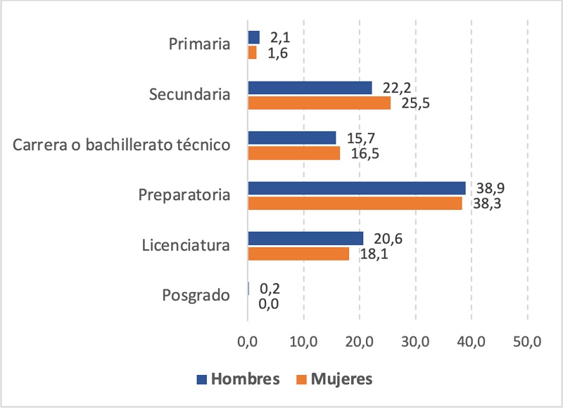 La escolaridad de las personas repartidoras es relativamente alta (Gráfica 7). Se observa que las proporciones entre los niveles alcanzados por hombres y mujeres no son muy diferentes. Sin embargo, se percibe que la proporción de mujeres que llegaron solo hasta la secundaria es un poco más alta que la de los hombres, y en preparatoria y licenciatura es un poco más baja. La cuarta parte cursaron la secundaria; el 15% alcanzaron la educación media superior (bachillerato técnico), casi el 40% la preparatoria completa o incompleta y uno de cada cinco la licenciatura (gráfica 7). Estos datos rompen con la idea de que en los espacios públicos trabajan únicamente personas que tienen muy baja escolaridad, o bien, que el mercado de trabajo formal no garantiza mejores condicionales laborales.