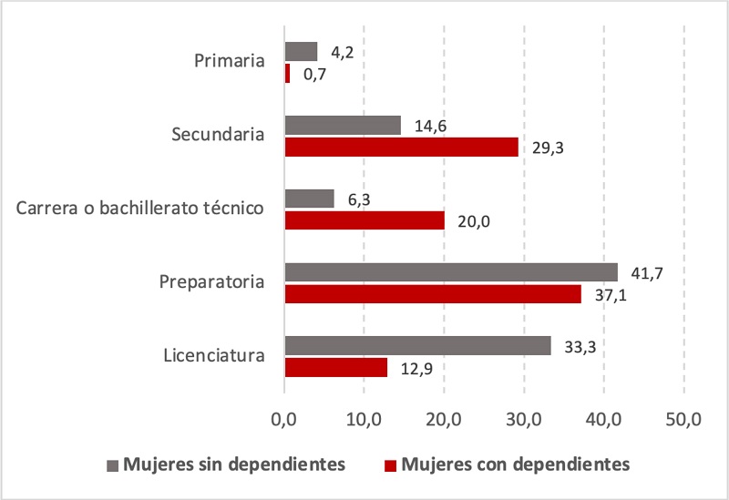 Cuando se compara la escolaridad de las mujeres repartidoras con y sin dependientes (Gráfica 8), se descubre una clara ventaja en el nivel alcanzado por las que no tienen dependientes, pues las mujeres sin dependientes muestran escolaridades más altas, frente a las mujeres con dependientes económicos que muestran menos años de escolaridad. Los datos señalan que la proporción de las que tienen dependientes y solo alcanzaron la secundaria es del doble, asimismo, las que llegaron al bachillerato técnico es el triple que las que no tienen dependientes; estas mujeres pueden ser madres solas cuyas condiciones socioeconómicas y familiares no les permitieron seguir estudiando por imperativos laborales. En cambio, las mujeres sin dependientes que llegaron a la universidad son más del doble que las que tienen dependientes. Esto parece mostrarnos que el nivel socioeconómico de las que no tienen dependientes es más alto.