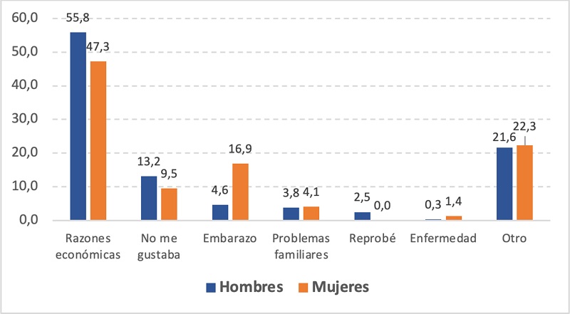 Las personas repartidoras dejaron de estudiar en todos los casos, principalmente por motivos económicos (Gráfica 9), sobre todo los hombres; pero, en el caso de las mujeres, el embarazo también se presenta como un factor que influye fuertemente para la interrupción de los estudios. En México, alrededor de 1000 mujeres entre 12 y 19 años se vuelven madres cada día, sin haberlo planeado ni deseado; este fenómeno está ligado fuertemente al nivel de ingresos de sus hogares y a su origen étnico; además, también está fuertemente ligado a la violencia de género (Arvizu et al., 2022). El embarazo temprano sigue siendo uno de los principales problemas en el país que impide a las mujeres su desarrollo profesional y personal.