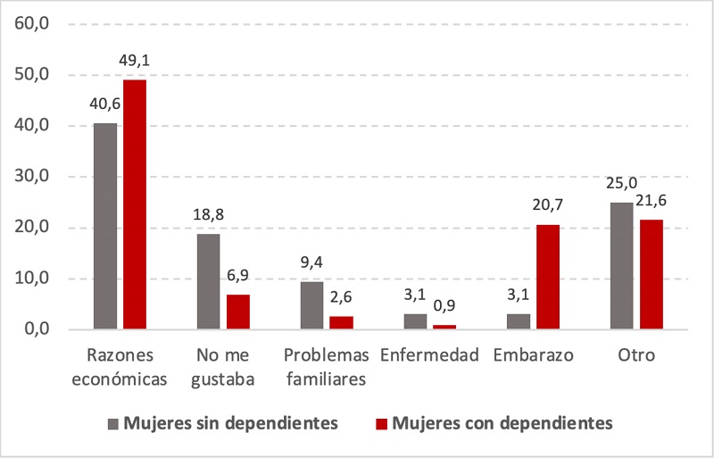 En México, la falta de acceso a la escolaridad y a la información sobre los derechos sexuales y reproductivos está ligada a motivos económicos, lo que, en muchos casos, conlleva a embarazos no deseados. Este fenómeno lo vemos representado también para las mujeres repartidoras, ya que las cuestiones económicas se presentan como una de las razones más importantes para las que tienen dependientes económicos (Gráfica 10). Para ellas el embarazo es una razón muy importante que explica la interrupción de los estudios. En cambio, el porcentaje de mujeres que abandonaron sus estudios porque no les gustaban, por problemas familiares o por enfermedad, es más alto para las mujeres sin dependientes que para las que tienen dependientes económicos.