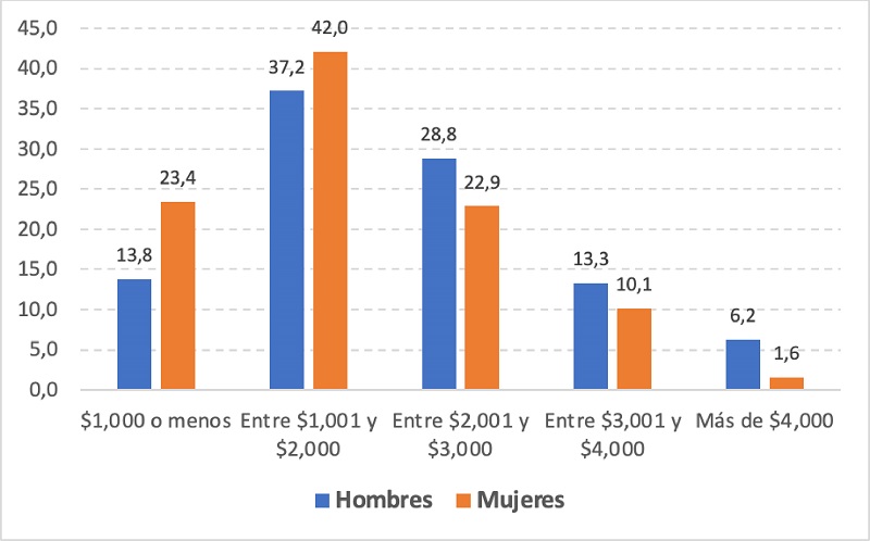 Los ingresos económicos son datos claves para examinar las desigualdades entre sexos y entre mujeres con y sin dependientes. Hay cinco grupos de personas según los ingresos. De menor a mayor, el grupo más pequeño gana más de cuatro mil pesos a la semana (232 dólares o más)9 y la proporción de hombres es cuatro veces mayor que la de mujeres; el segundo grupo en dimensiones es el de las personas que ganan entre tres y cuatro mil pesos a la semana (174 dólares) y en el que también hay mayor proporción de hombres; el tercer grupo es el de quienes ganan mil pesos o menos (58 dólares o menos); en él la proporción de mujeres es casi del doble que la de los hombres; el cuarto grupo reúne a quienes ganan entre dos mil y tres mil pesos y en que la proporción de hombres es mayor; el quinto y último grupo es el de las personas que ganan entre mil y dos mil pesos a la semana y en él la proporción de mujeres es mayor que la de los hombres. El promedio total es de $1,706.00 pesos semanales (71 euros, 86 dólares). Sin embargo, las mujeres reciben 25% menos que los hombres. Ellos obtienen en promedio $1,766.50 pesos semanales (73.60 euros, 89 dólares), mientras que ellas solo ganan 1,324.90 (55.20 euros, 66.80 dólares). Esto se debe a que hacen menos entregas, pues usan más la bicicleta y las entregas a pie y en transporte público; por lo tanto, no pueden realizar el mismo número de entregas que los hombres o, tal vez trabajen menos horas pues tienen que dedicar tiempo para el cuidado de sus dependientes económicos