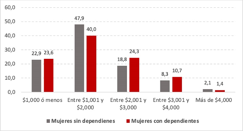 Al comparar los ingresos de las mujeres con y sin dependientes, las que menos ganan se reparten por partes iguales entre las que tienen y no tiene dependientes; el grupo más numeroso es el de las que ganan entre mil y dos mil pesos en donde la proporción de mujeres sin dependientes es un poco mayor. En los dos siguientes grupos de mujeres que ganan entre dos mil y cuatro mil pesos, la proporción de mujeres con dependientes es mayor. Esto significa que estas mujeres destinan más tiempo al trabajo y menos al estudio, porque de ellas depende el sostén de otras personas.