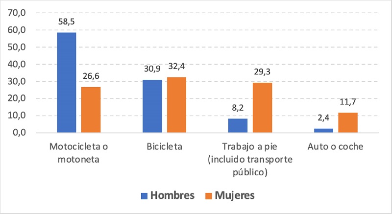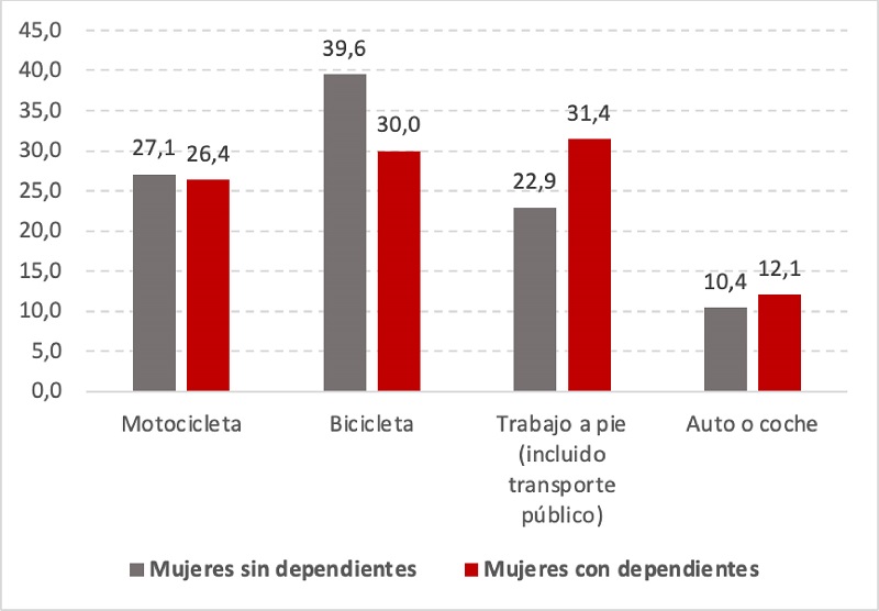 El hecho de que en estos trabajos haya el triple de mujeres con dependientes (75%) que de mujeres sin dependientes (26%), en el contexto generalizado de un rechazo femenino a estos empleos, puede significar que el trabajo en plataformas se presenta como una alternativa u oportunidad para mujeres que necesitan un empleo muy flexible que les permita atender a los dependientes a su cargo y, al mismo tiempo, trabajar en un empleo remunerado, o que, al perder su empleo, encontraron una forma de emplearse rápidamente y empezar a generar un ingreso económico; es por eso que quizá algunas de ellas hacen entregas a pie o en transporte público.