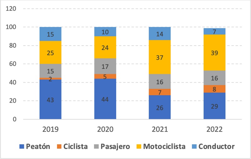 Al principio de la pandemia, las personas más vulnerables de la vía pública en cuanto a accidentes fatales fueron las peatonas. Sin embargo, a partir de la emergencia sanitaria y el confinamiento durante el segundo trimestre de 2020 y durante el avance de la crisis, la proporción de decesos de estas personas descendió a la mitad y en cambio la proporción de motociclistas fallecidas superó a la de las demás personas usuarias. Por su parte, la relación de personas ciclistas fallecidas se cuadruplicó. Este aumento de accidentes fatales puede ser atribuible al incremento notable de personas repartidoras por aplicaciones en vehículos de dos ruedas y a la mayor velocidad de vehículos automotrices facilitada por el menor tráfico y las vías más despejadas. Por ejemplo, Rappi, según su director general, aumentó de 30 mil a 50 mil personas repartidoras en 2020.7
