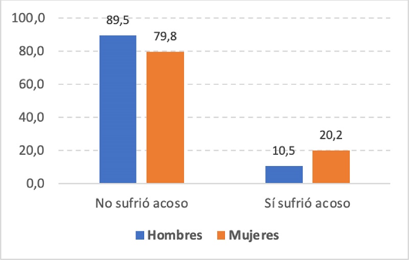 Con los datos anteriores, se muestran los diversos tipos de violencia y peligros a los que se enfrentan cotidianamente las mujeres en el desempeño de su trabajo. Por su parte, las mujeres repartidoras, por realizar su trabajo en los espacios públicos y frecuentemente en las noches, también son susceptibles de sufrir acoso y violencia sexual. Por su parte, los hombres sufren particularmente de robos y asaltos. Por la encuesta sabemos que una de cada cinco mujeres declaró haber sufrido acoso sexual en el desempeño de su trabajo, mientras que en el caso de los hombres es uno de cada diez (Gráfica 16).