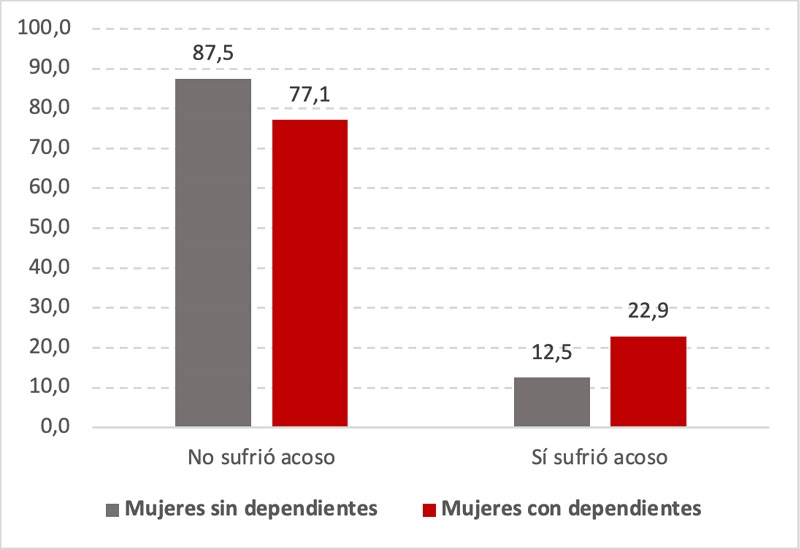 (Testimonio de una mujer repartidora, 36 años, estudió licenciatura en ciencias de la comunicación con especialidad en mercadotecnia).Si se compara el acoso sexual en mujeres con y sin dependientes, este ocurre en mayor proporción en las mujeres que tienen dependientes económicos (Gráfica 17) pues son las mujeres con dependientes la que tendrían más urgencia de trabajar también turnos nocturnos, enfrentándose con esto a accidentes y a algún tipo de agresión sexual.