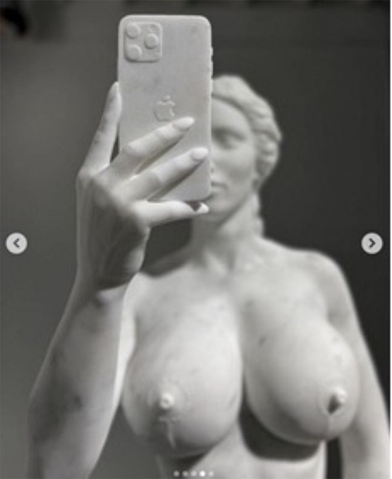 Tais características estão presentes na imagem exibida no perfil de @drvid (Figura 1), mais uma vez com referência ao campo da arte. A cirurgiã reproduz a obra “Beleza algorítmica”, criada em 2022 pelo artista plástico Greg Lansky – uma versão da escultura Vênus de Milo, estátua grega do período helenístico. Lansky “atualiza” a estátua, ao incluir a figura feminina em uma pose de selfie e ao ajustar as proporções corporais para se alinhar a um padrão contemporâneo de beleza. Em sua conta pessoal, ao explicar a obra, Lansky pergunta: “Quanta dor você sentiria para se sentir amado?”.9