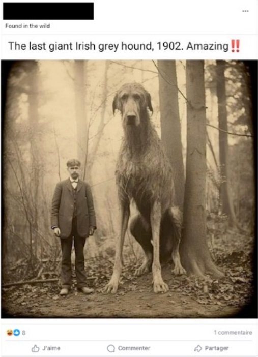 No denominado exotismo histórico, é a distância temporal que está em questão. Este se faz ainda mais presente nas imagens analisadas: o efeito exotizante se produz através de escolhas estéticas, como fotografias em preto e branco e sépia, efeitos de envelhecimento e desgaste da imagem, ou ainda nas roupas das pessoas representadas, que remetem a outras épocas e lugares. Tal artifício é utilizado tanto nas fotografias de criaturas quanto de objetos e lugares. Exemplar desse tipo de recurso é a imagem de um cachorro gigante, com cerca de duas vezes o tamanho do humano ao seu lado. Parecendo ser uma fotografia tirada em uma floresta, a imagem é em tons de sépia, e o homem ao lado do animal veste trajes que remetem aqueles utilizados nas primeiras décadas do século XX. Quando encontrada in the wild por um membro do grupo, a imagem vinha acompanhada da legenda “O último galgo cinzento irlandês gigante, 1902. Incrível!”. Ainda que a existência de um cachorro de mais de três metros de altura seja pouco crível, por sua tonalidade e pelo vestuário do homem que ali figura, a imagem poderia facilmente fazer-se passar por uma fotografia antiga. A indicação de que se trata do último da espécie também abre espaço para que o público que recebe a imagem cogite a possibilidade da existência, num passado relativamente distante, de tal espécie, quiçá atualmente extinta.