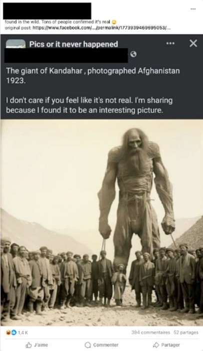 Bastante semelhante é o que acontece com a imagem de um crânio gigante, compartilhada in the wild em uma página dedicada à arqueologia. A baixa qualidade da imagem, suas cores e as vestimentas dos homens que posam junto à caveira de 4 metros de altura reforçam a distância temporal desta com relação à audiência. A legenda completa o gap existente: “Um achado enigmático: arqueólogos posam ao lado de um crânio descoberto em 1838”. Além da distância temporal, a distância geográfica tem um papel na atribuição de credibilidade a essa imagem, já que o local retratado parece remeter a ruínas em meio a um deserto. O mesmo acontece com a imagem do gigante de Kandahar,5 publicada exaustivamente no grupo e objeto de centenas de comentários. A legenda da imagem indica ser uma fotografia tirada em 1923 no Afeganistão. E ele não é o único gigante. Outra imagem, que teria sido encontrada in the wild no site de um jornal sensacionalista, mostra uma figura humanoide com o rosto coberto por pelos ou galhos. Comparada aos outros personagens da cena, a figura do gigante teria facilmente seis metros de altura. Na fotografia monocromática ele está cercado por uma dezena de homens, todos vestidos com ternos que evocam roupas do final do século XIX.