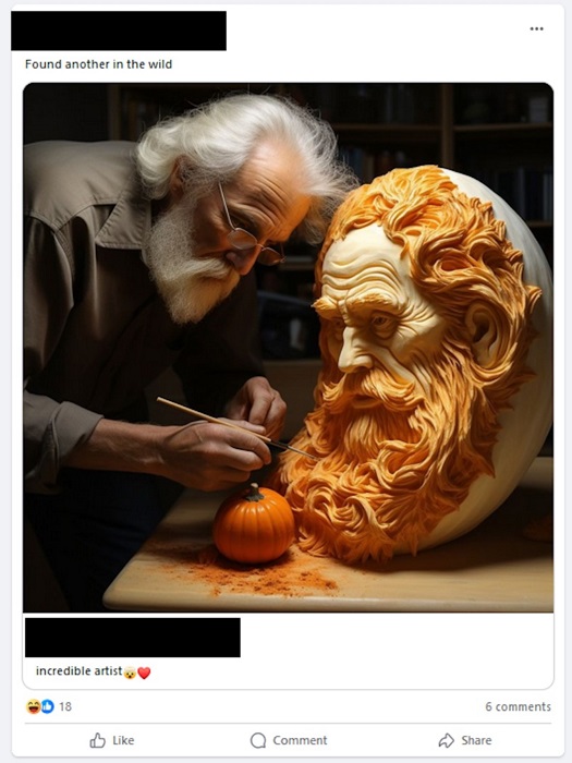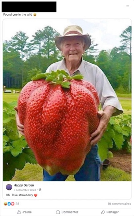Quando publicadas no interior do grupo, todas essas diferentes categorias de imagem têm a função de servir de matéria-prima para a discussão sobre serem fruto ou não de IA, ou ainda sobre a ingenuidade dos demais internautas, que acreditam em sua veracidade. Mas in the wild, elas têm outros propósitos. Analisando o tipo de imagem e as legendas que as acompanham quando usadas fora do grupo, percebemos uma característica comum que diz respeito à excepcionalidade daquilo que é retratado. Beirando uma espécie de sensacionalismo, seu uso parece ser uma estratégia para atrair a atenção do público. Aqui a excepcionalidade concerne o caráter raro e estranho de humanos e animais ordinários, ou daquilo que eles são capazes de fazer. Além das senhoras idosas com suas esculturas em crochê, homens idosos e crianças de todos os gêneros são mais frequentemente representados nesse tipo de imagem. É o caso, por exemplo, da suposta fotografia de um agricultor idoso que mostra orgulhoso o morango gigante que cultivou, compartilhada in the wild por uma página de jardinagem. Outro senhor idoso esculpindo em uma abóbora seu autorretrato, extremamente detalhado e realista, figura numa imagem cuja legenda diz “incrível artista”. Um terceiro exemplo concerne também um autorretrato ultrarrealista, mas dessa vez esculpido em areia por uma criança, acompanhado da legenda incitadora de likes “Fantástico trabalho! Vamos mostrar apreciação!”.