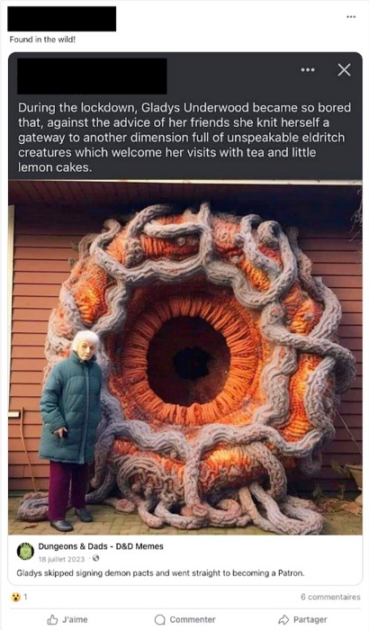 Num contexto no qual muito se fala sobre os impactos da inteligência artificial no trabalho criativo humano – por exemplo, quando se aborda obras de arte criadas por IA –, é curioso que representações da atividade humana criadora e criativa sejam tão presentes. De um lado, presentes em grande número de imagens que se fazem passar por fotografias de objetos que existiriam fisicamente. De outro, justamente como o tipo de imagem que é mais denunciado como sendo criado por IA, a partir do questionamento sobre a impossibilidade de que tamanha habilidade técnica ou artística seja humana: esculturas excessivamente detalhadas, peças de crochê tão grandes que exigiriam anos de trabalho para serem confeccionadas, veículos cuja tecnologia seria demasiado avançada. Os trabalhos em crochê são, aliás, uma pequena obsessão do grupo: numerosas são as imagens found in the wild de senhoras idosas com suas monumentais obras manuais, identificadas ali como sendo fruto de IA, tanto as obras quanto suas criadoras.