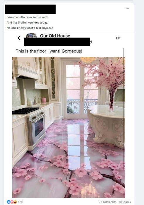 No paradigma pós-fotográfico, como dissemos anteriormente, não há um referente real que possa ser comparado à simulação imagética das pessoas, lugares ou objetos retratados. Mas há grandes conjuntos de dados que alimentam os modelos matemáticos geradores de imagens. A partir de padrões estatísticos, alguns elementos desses conjuntos de dados serão associados, colocados em correspondência, podendo o resultado coincidir ou não com algo cuja existência é crível. Os argumentos evocados em torno da imagem, assim, não dizem tanto respeito à semelhança como parecença, e mais à verossimilhança como plausibilidade. Na imagem de um piso de cozinha com flores de cerejeira preservadas em resina, o debate sobre a veracidade da imagem é intenso, ao contrário das outras imagens cuja natureza artificial é óbvia para o grupo. Alguns comentários afirmam que a imagem poderia ser real, já que exequível: “Isto pode ser IA, mas é exequível... Mas toda aquela resina epóxi custaria uma fortuna e pesaria uma tonelada”. Outro acrescentou: “Já vi pavimentos semelhantes na vida real, mas depois de algum tráfego o aspecto transparente desaparece”. Outros comentários afirmam que a imagem é gerada por IA, indicando onde olhar para identificar a artificialidade: “Os botões na frente do fogão”, “Normalmente, procuro nos reflexo dos objetos”.