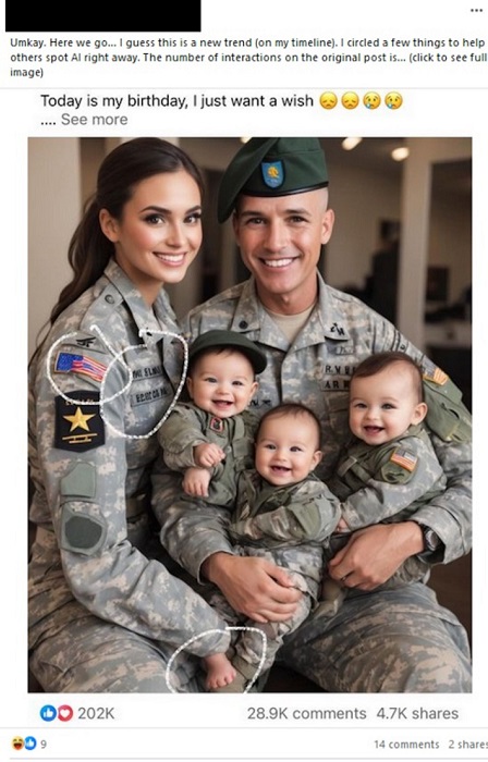 Outros detalhes também podem denunciar uma imagem gerada por uma IA, como por exemplo sequências de caracteres mal colocados, o que leva à afirmação frequente de que “a IA não sabe escrever”, ao menos quando está gerando imagens a partir de um prompt textual. Além do número de dedos e das palavras e frases, citam proporções corporais, assimetria de roupas, forma dos pés, joelho e cotovelos, acessórios como óculos e máscaras que se fusionam ao rosto etc. Os detalhes do rosto também são utilizados como critério, razão pela qual os membros do grupo sugerem sempre dar zoom nas imagens. O argumento é que, como a IA generativa trabalha a partir de bancos de imagens, frequentemente o rosto de celebridades e figuras públicas apresentaria menos falhas, já que uma quantidade maior de imagens-fonte está disponível, mas em se tratando do rosto de pessoas comuns, o resultado não seria o mesmo.