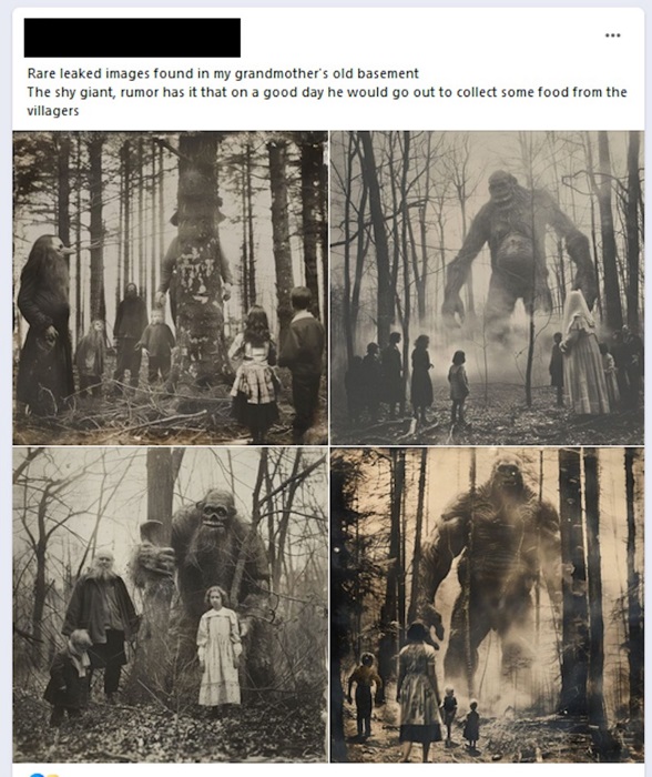 No interior do grupo, deparamo-nos com uma categoria de imagens que fugia do propósito inicial. Essa categoria, chamada found in the wild, dizia respeito a imagens encontradas fora do grupo, que eram geradas por IA, porém, utilizadas como se fossem fotografias reais. A expressão in the wild (“na natureza” ou “no meio natural”), remete à ideia de um uso indiscriminado, ou selvagem, de tais imagens, feito fora das fronteiras da domesticidade do grupo. Como exemplifica um de seus membros, “in the wild significa que eles descobriram [a imagem] num post não relacionado. Neste caso, uma dessas páginas de alienígenas antigos/conspiração achou a foto e a está tratando como real”. Em torno dessa categoria de publicações, os membros do grupo discutiam as eventuais anomalias que permitiam identificar uma imagem como sendo produzida por IA, mas também os equívocos dos humanos que recebem tais imagens, assim como dos critérios de reconhecimento ou não de uma imagem como sendo produzida por IA.