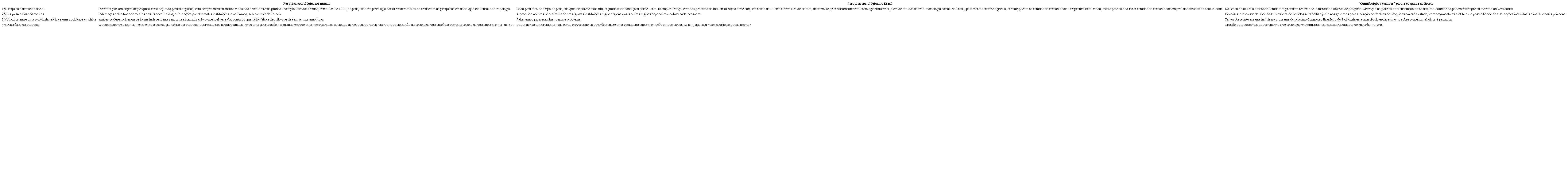 Insistimos o bastante sobre as dificuldades específicas que apresenta a pesquisa no Brasil – extensão do país, lacunas bibliográficas, lacunas de dados estatísticos sobre o passado, resistência dos pesquisados aos pesquisadores, individualismo dos cientistas brasileiros – para considerarmos útil voltar a elas mais uma vez. Sobretudo porque algumas dessas dificuldades se encontram em muitos outros países; porque algumas dentre elas estão em vias de desaparecer e porque no dia em que houver uma colaboração mais estreita entre estatísticos e sociólogos, estes últimos saberão como delimitar exatamente os grupos representativos dos diversos setores sociais – o Brasil não terá mais nada a invejar das outras nações. Gostaríamos, portanto, de examinar aqui somente para onde conduzir a pesquisa sociológica brasileira no conjunto da pesquisa mundial. Parece-me que podemos definir em bloco o estado atual da pesquisa sociológica no mundo, da seguinte maneira: