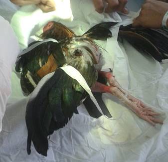 Un gallo fino de pelea de raza Jacab (Gallus gallus domesticus), de 2 años de edad ingresó al servicio de consulta en la clínica veterinaria “Julio E. Cuervo”, de la Universidad de Córdoba, en Berasteguí, Ciénega de Oro, Córdoba (8º 52’N, 75º O), el gallo presentó un nódulo de 2 cm de diámetro en la región alar izquierda (escapulo-humeral), de dos meses de evolución posterior a un combate. El paciente presenta desparasitación y vacunación contra Newcastle vigente. Existe información de tratamiento farmacológico para tratar las lesiones del combate con penicilina benzatínica, 60 días antes.
