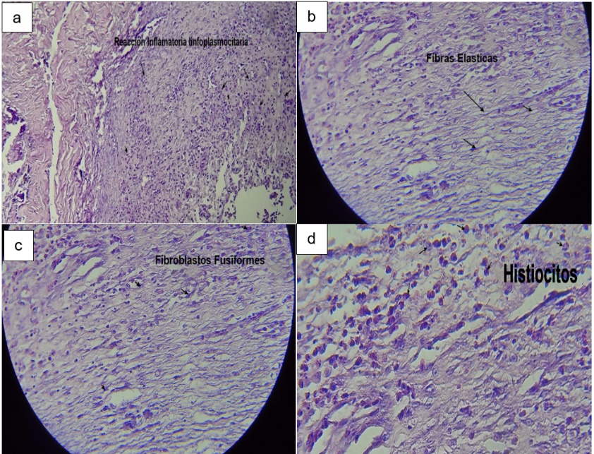 La muestra fue enviada a laboratorio de histopatología para el diagnóstico definitivo, se describe, una muestra con proliferación de fibras elásticas y fibroblastos fusiformes e histiocitos, reacción inflamatoria linfoplasmocitoria de aspecto granulomatosa, y por lo tanto tratándose de un granuloma inflamatorio crónico (Figura 4).