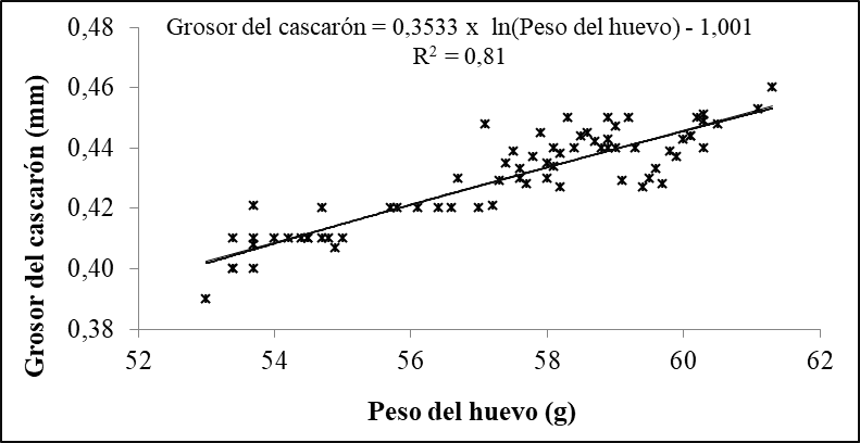 En conclusión la adición de las diferentes dosis de carbonato de calcio en las últimas horas de la tarde en gallinas ponedoras Hy-Line Brown en inicio de postura, no influyó sobre el peso del huevo, pero si influenció sobre el aumento del grosor del cascarón, al adicionar 1.50 g/ave/día de carbonato de calcio con una granulometría de 2 a 4 mm. Conjuntamente, se puede estimar el grosor del cascarón a través del peso del huevo realizando el siguiente modelo de regresión (Grosor del cascarón = 0.3533 x ln(Peso del huevo) - 1.001).