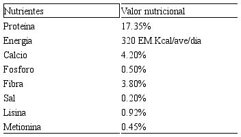 Manejo del experimento. Se utilizaron 200 ponedoras de la línea genética Hy-Line Brown en inicio de postura 22 a 30 semanas de edad, las cuales se encontraron separadas a razón de 5 aves por jaula. Las jaulas presentaron las siguientes dimensiones, 55 cm de ancho por 45 cm de largo, la maya que soporta los huevos es de 15 cm de largo para cada jaula. Las aves dispusieron de una dieta que se formuló cubriendo las necesidades de nutrientes de acuerdo al manual de manejo de ponedoras Hy-Line Brown (1) (Tabla 1). El alimento se suministró diariamente a las 7:00 de la mañana y el agua se ofreció ad libitum.