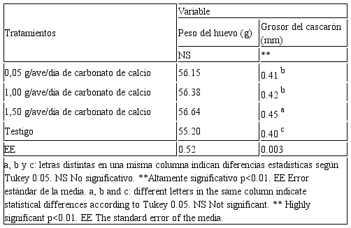 Grosor del cascarón. Los resultados del grosor del cascarón se aprecian en la Tabla 2. Se detectó una alta significancia estadística p<0.05. El tratamiento con 1.50 g/ave/día de carbonato de calcio fue el que mostró mejor promedio 0.45 mm, en comparación con los otros tratamientos.