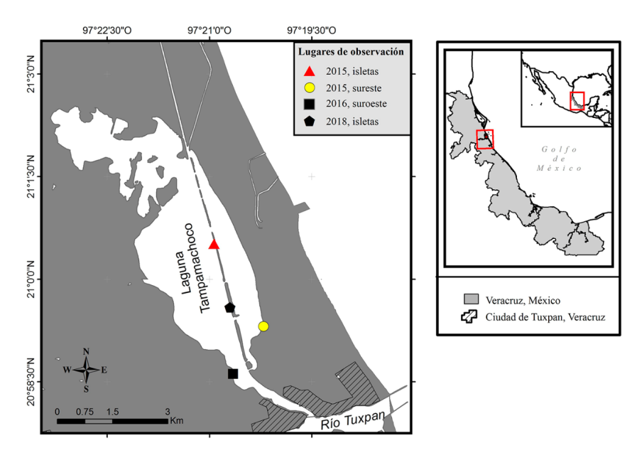 Área de estudio. La laguna Tampamachoco se localiza en el municipio de Tuxpan, Veracruz, México (entre 21° 02’ 10” N, 97° 22’ 50” W y 20° 58’ 40” N, 97° 20’ 29” W, (Figura 1). Es un ecosistema lagunar somero con aguas de elevada turbidez (14) y características meso-polihalinas cuyas variaciones de salinidad fluctúan entre 20 a 40 ups y temperaturas superficiales de 25-30°C (15). Además, durante la primavera, se observa un incremento de la salinidad y una disminución en otoño, mientras que la temperatura es mayor en verano y menor en invierno (16). La laguna, que se encuentra separada del mar por una barrera arenosa, presenta aproximadamente 10.6 km de largo y 2.7 km de ancho, abarcando un área de 15 km.. En los márgenes de la laguna y en las isletas se desarrolla R. mangle y en sus raíces sumergidas se presentan algas e invertebrados epibiontes (17).
