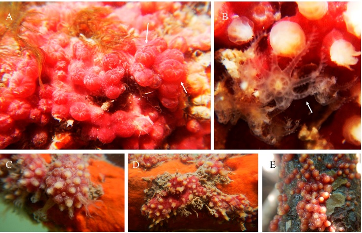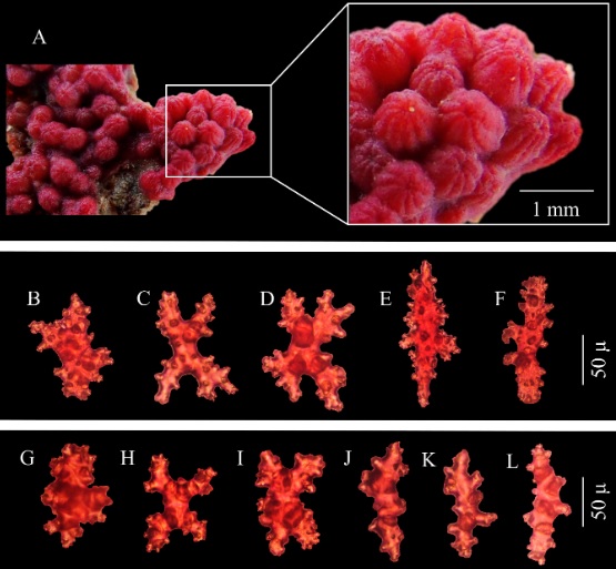Descripción morfológica. Colonia incrustante de color rojo rubí (Figura 2 y 3A). Los cálices son notoriamente visibles y se proyectan sobre la superficie de la colonia hasta una altura de 0.8-1.2 mm (Figura 3C-E). El antocodio, que comprende la parte retráctil, la boca y los tentáculos, son de color blanco translúcido sin escleritos (Figura 3B-C). Aproximadamente 13 pínulas por tentáculo (Figura 3B). La corteza (estolón) y la pared del cáliz (antostele) compuesta por escleritos ovalados de 40-60 μm de diámetro y 100-110 μm de largo, presentando de cuatro, cinco y hasta seis radios (Figura 4B-D y 4G-I). También presenta escleritos en forma de husos rectos de 98-120 μm de largo y husos ramificados de 105-118 μm de largo (Figura 4E-F y 4J-L).