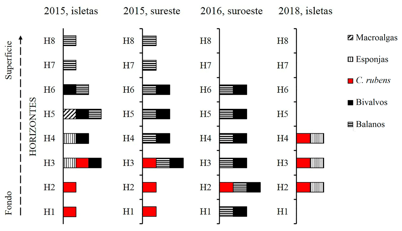 Con relación a la distribución vertical, se registró un máximo de ocho horizontes con epibiontes en las raíces de mangle. La presencia de los octocorales se observó en los primeros cuatro horizontes (10-40 cm), los cuales se sitúan cerca del sedimento (Figura 5). Entre los horizontes H2 y H3 se observó a C. rubens cohabitando con bivalvos y balanos, mientras en el 2018 se encontró compartiendo el espacio únicamente con esponjas en los horizontes H2 al H4 (Figura 5). En los horizontes superiores cercanos a la superficie del agua se observaron habitualmente balanos y bivalvos (Figura 5).