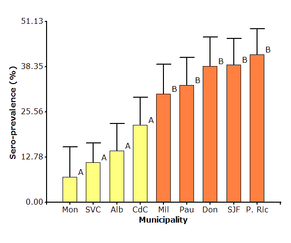 Low sero-prevalence of BLV was found in La Montañita (7.12%), San Vicente del Caguán (14.62%), Albania (21.85%), and Cartagena del Chairá (30.70%) municipalities, and statistical difference in this four municipalities was not found; in the same way, higher sero-prevalence of BLV was found in Milán (30.70%), El Paujil (33.10%), El Doncello (38.92%), San José del Fragua (38.92) and Puerto Rico (41.81%) municipalities, these last five municipalities showed the statistical difference with the first four (Figure 1).