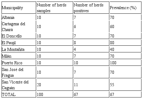 In total were sampled 1000 bovines distributed in 100 herds of dual-purpose cattle, of which 893 blood serum corresponding to cows, 80 to Bulls and 27 to hemolyzed blood serum because they were hemolyzed in the transport.