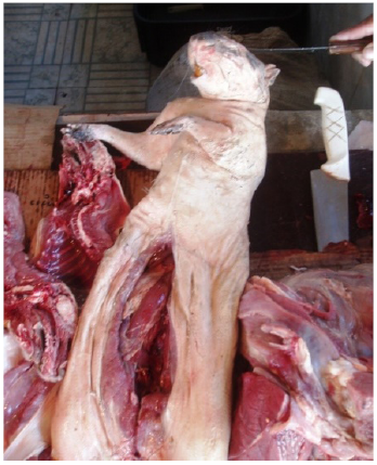 Através dos 160 questionários e entrevistas realizadas nas feiras livres visitadas dessas cidades no estado do Amazonas, constatou-se um forte indício de caça e comércio ilegal. Exemplo disso foi observado na cidade de Manacapuru. Durante a entrevista com um dos comerciantes da feira-livre, após muita insistência, este permitiu o registro fotográfico de um espécime sendo vendido em seu estabelecimento (Figura 2). Ao ser indagado sobre sua procedência este informou que “[...] é a população ribeirinha (pessoas que residem às margens dos rios na região amazônica), em torno da cidade, que traz esses animais aqui, daí a gente vende para a população que vem aqui comprar. Tem feira na periferia da cidade, que tem vários animais sendo vendidos lá, inclusive macaco, mas não lhe aconselho fazer esse tipo de trabalho lá, é muito perigoso [...] as pessoas procuram esse tipo de carne porque a carne de caça é bem mais em conta em relação à carne de gado [...]”.