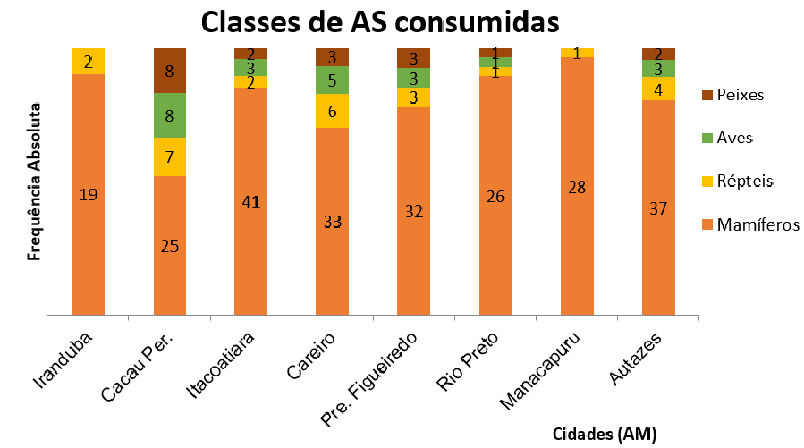 Nas cidades do estado do Amazonas é evidente, conforme a Figura 3, a frequência absoluta de mamíferos consumidos. A cidade de Itacoatiara foi a que mais apresentou frequentadores que compram carne de mamíferos (41 citações), seguido dos frequentadores da feira de Autazes (37 citações). As cidades de Iranduba e Manacapuru foram as únicas que apresentaram apenas duas classes (mamíferos e répteis) de AS consumidas, as demais, apresentaram as quatro classes. Além disso, dentre todos as cidades pesquisadas, Iranduba apresenta a menor frequência absoluta (19 citações) de carne de mamíferos consumida.