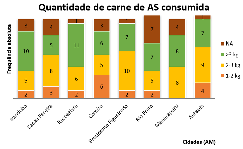 Em termos de quantidade de carne consumida, há certa igualdade entre 2 a 3 kg e acima de 3 kg de carne. A cidade de Itacoatiara se destacou, acima de 3 kg (11 citações) e a cidade de Careiro mostrou o maior número (06 citações) para 1 a 2 kg para consumo. Em Manacapuru, todos os indivíduos entrevistados afirmaram que a quantidade de carne consumida nunca está abaixo de 1 a 2 kg. Em todas as cidades houve indivíduos que não quiseram informar (NA) a quantidade comprada (Figura 4).