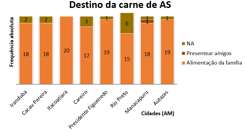 A compra da carne de AS nas feiras-livres nas cidades do estado do Amazonas é destinada à alimentação da família, principalmente em Itacoatiara (20 citações), como se pode observar no Figura 5. Apenas em Manacapuru foi relatado a compra de carne de AS para presentear um amigo (01 citação). Porém, com exceção de Itacoatiara, em todas as outras cidades, sempre houve quem não quisesse informar (NA) o destino da carne comprada na feira-livre.