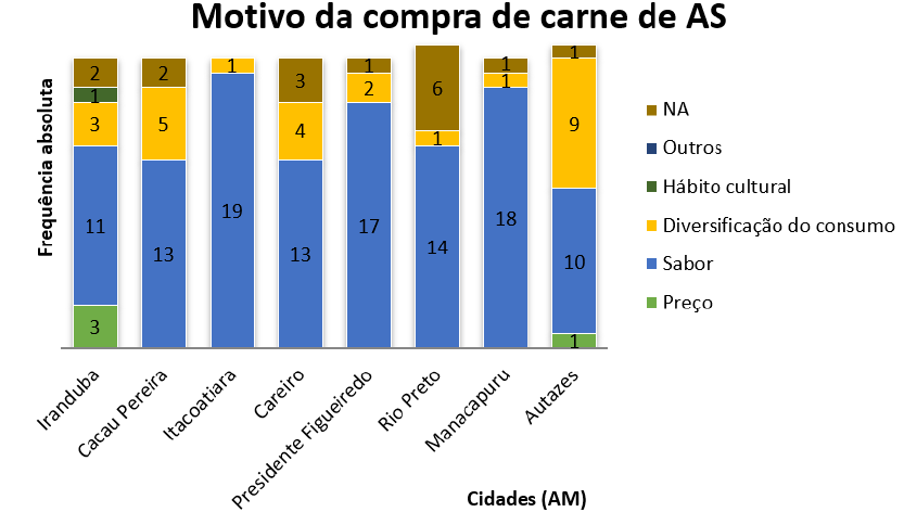 A principal razão da compra de carne de AS nas feiras-livres é o sabor diferente do animal. Isso ficou mais evidente na cidade de Itacoatiara (11 citações). Em apenas duas cidades, Iranduba e Autazes, o motivo da compra também é o preço (03 e 01 citações, respectivamente). Em todas as cidades a justificativa da compra da carne de AS é diversificar a dieta alimentar, principalmente em Autazes (09 citações). Em Iranduba, como se percebe no Figura 6, foi informado a compra de carne de AS por ser um hábito cultural da região (01 citação).